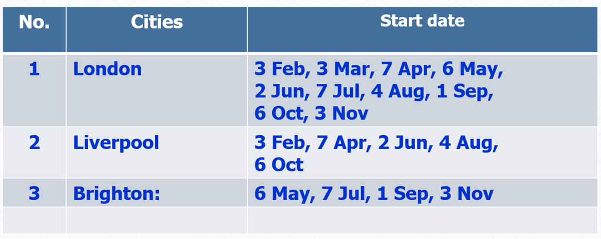 วันที่เริ่มต้นโปรแกรมการเรียน (Program Start Date) Columbia West College ได้แบ่งช่วงเวลาเป็น 4 เทอม ตามฤดูกาล และแบ่งย่อยแต่ละTerm ออกเป็น Module รายละเอียดดังนี้: