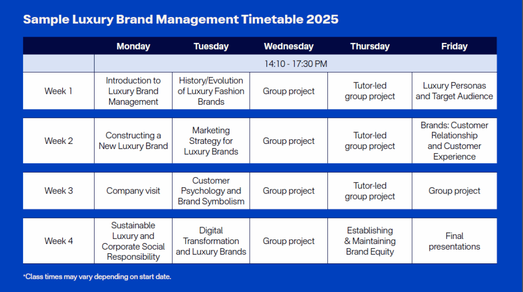 ตัวอย่าง ตารางการเรียนของ Luxury Brand Management ปี 2025